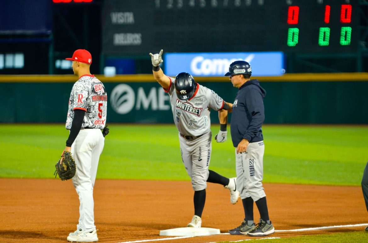 La novena regiomontana realizó seis dobles matanzas, mientras Zoilo Almonte bateó dos jonrones y produjo cuatro carreras para ganar 8-2 a los Rieleros de Aguascalientes para llevarse el primero de la serie en el renovado Andén Romo Chávez.