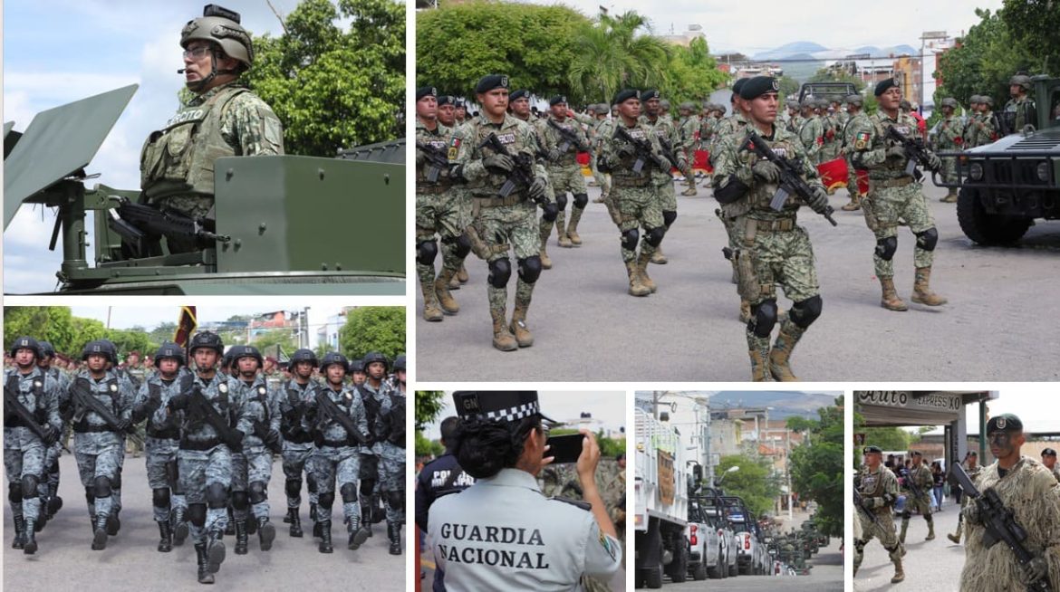 El acto cívico-militar se desarrolló bajo vigilancia permanente y en un ambiente controlado, como muestra de fuerza institucional tras el homicidio que evidenció el nivel de violencia y control que mantiene la delincuencia organizada en esta región de Tierra Caliente.