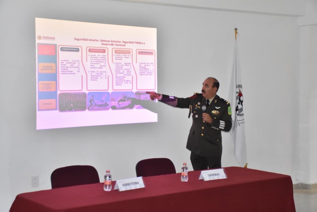 La ponencia estuvo a cargo del General Brigadier de Estado Mayor Ignacio García Brito, quien expuso los elementos que conforman el concepto de Seguridad Nacional, así como la participación de la Secretaría de la Defensa Nacional en su protección. El contenido incluyó la diferenciación entre Seguridad Interior, Defensa Exterior y Seguridad Pública, con el propósito de generar claridad sobre las responsabilidades institucionales en cada ámbito.