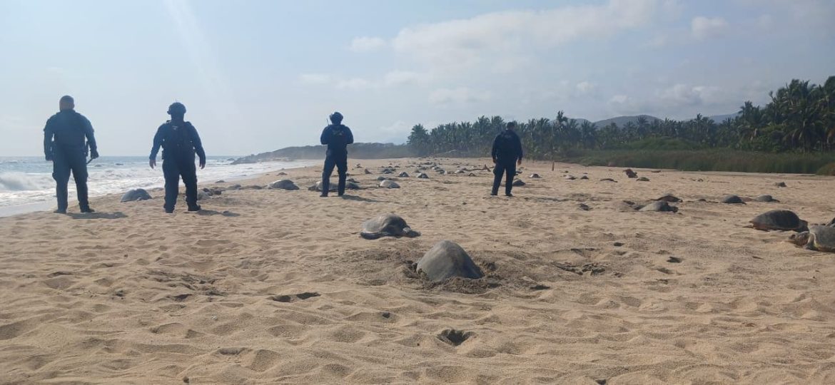 Agentes de la Secretaría de Seguridad Pública (SSP) vigilan el arribo de tortugas marinas en las playas de Aquila, una especie catalogada en peligro de extinción.