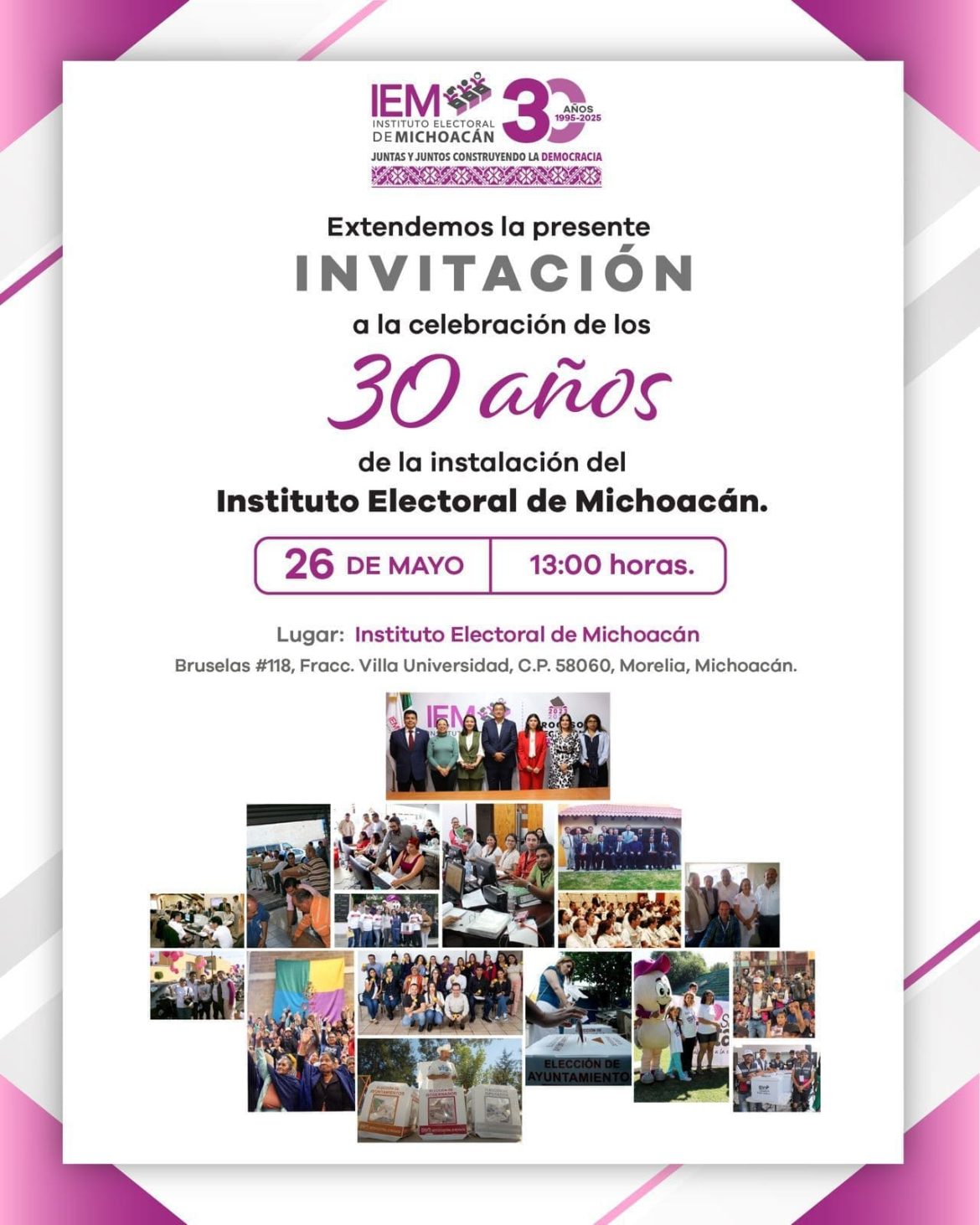 El Instituto Electoral de Michoacán (IEM) llevará a cabo este 26 de mayo de 2025 una ceremonia conmemorativa por el 30 aniversario de su fundación. El acto, que se realizará a las 13:00 horas en sus instalaciones ubicadas en Bruselas No. 118, colonia Villa Universidad de la ciudad de Morelia, marcará tres décadas de funcionamiento del órgano electoral local.