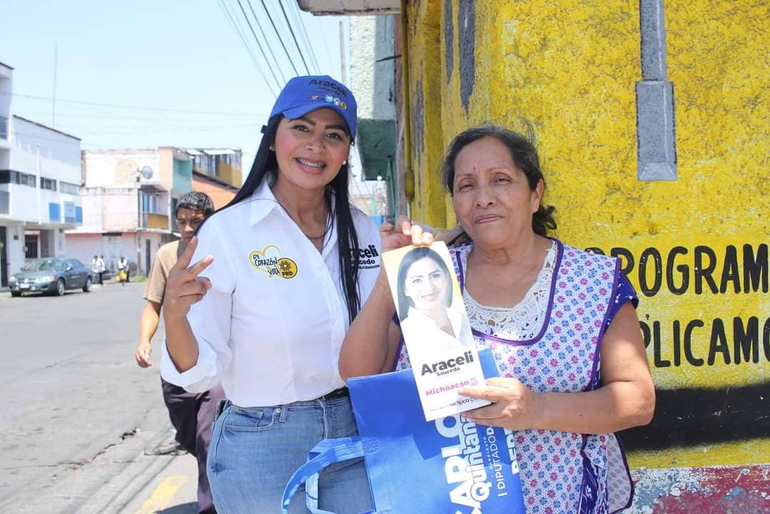 -En un intenso recorrido de brigadeo por Morelia, en compañía de Carlos Quintana Martínez, candidato a diputado local por el PAN y el PRD, Araceli Saucedo destacó su compromiso para promover reformas con objeto de construir la paz social
