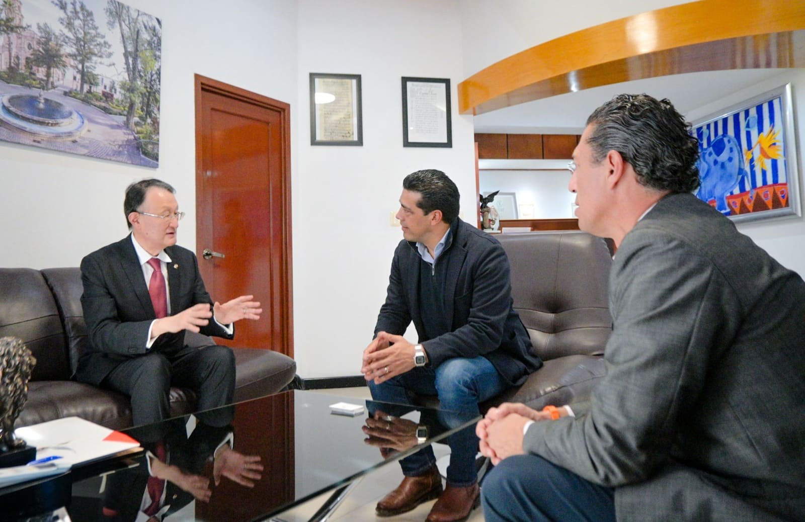Leo Montañez dio la bienvenida al diplomático japonés y agradeció la confianza depositada por la comunidad japonesa en Aguascalientes, destacando la relevancia de fortalecer los lazos empresariales para garantizar la permanencia de empresas niponas y atraer nuevas inversiones al estado. Asimismo, presentó programas emblemáticos como los del Instituto Superior en Seguridad Pública, enfocados en la tranquilidad ciudadana, y los relacionados con el turismo médico, resaltando su impacto positivo en la inversión y el bienestar social.
