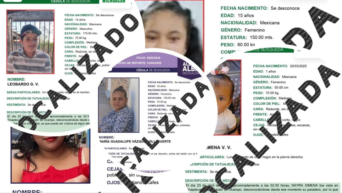 Se trata de María Guadalupe Vázquez Villafuerte, de 43 años; Alondra Vázquez Villafuerte, de 18 años; Lucía V.V., de 15 años; Leonardo G.V., de 14 años; y Nayra Ximena V.V., de un año de edad, quienes fueron reportados como desaparecidos el pasado 23 de abril de 2026.