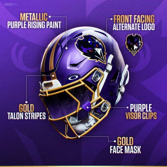 Baltimore reveló su casco alternativo «Purple Rising» el martes, convirtiéndose en el último equipo de la NFL en agregar una segunda opción a su armario de uniformes gracias a la relajación de las reglas de uniformes relacionadas con los cascos de la liga.